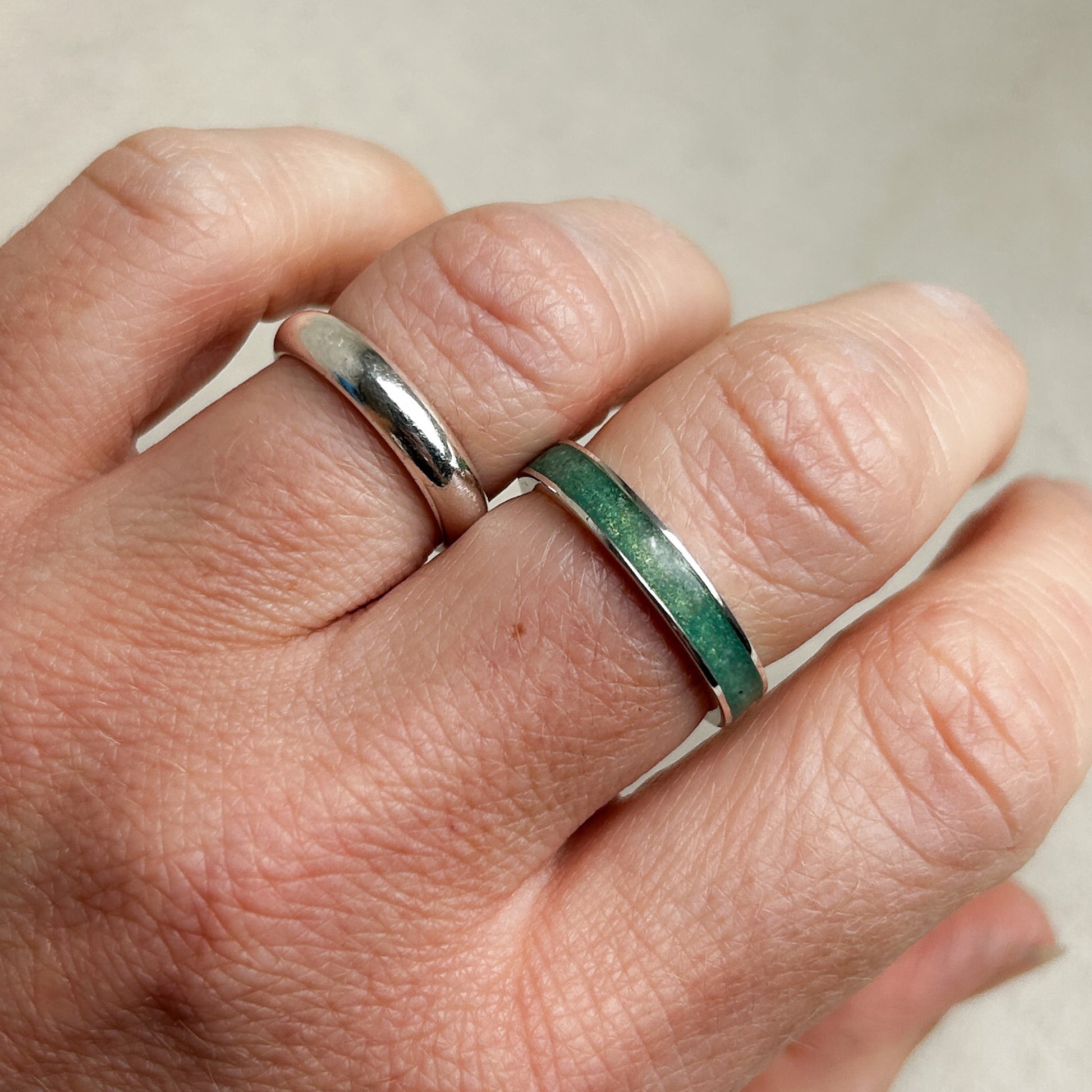 Create an everlasting connection to your loved one with this handmade ashes ring. A deep central channel holds cremation ashes within the background colour of your choice. The result is a luminous inlay that captures light, colour, and memory in every reflection.