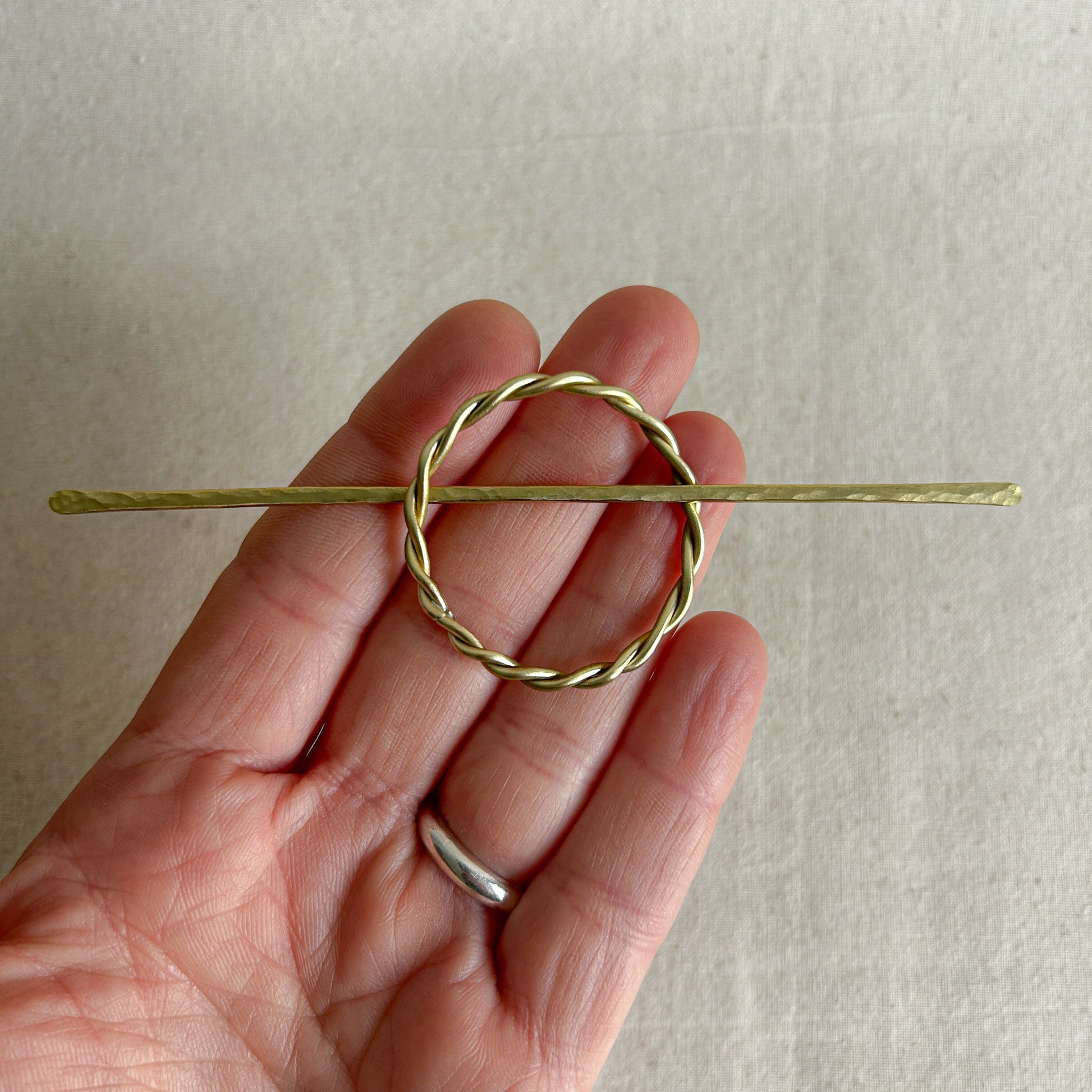 Each hair pin comes with a hoop and stick. Each stick has a hammered texture and is approximately 11cm long.