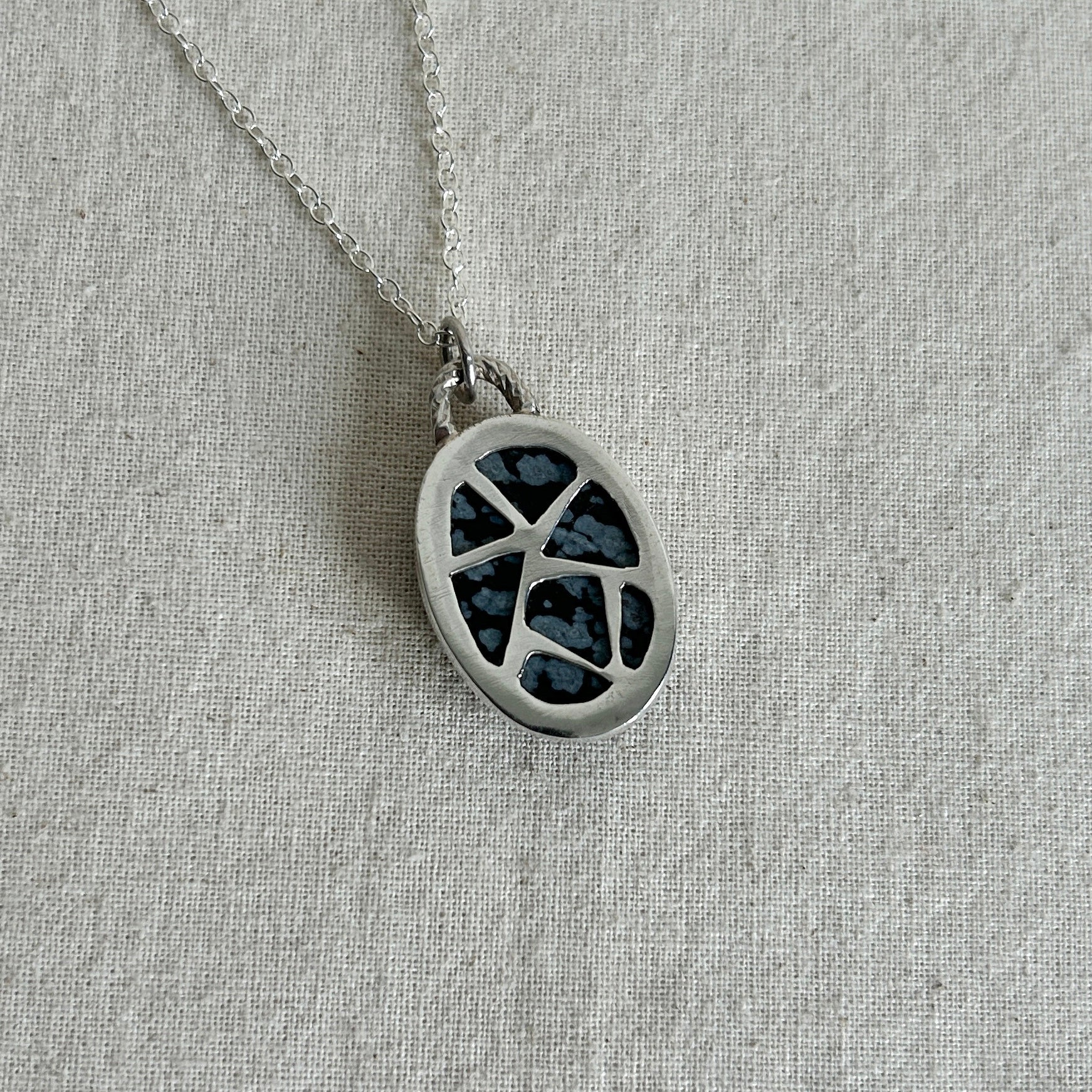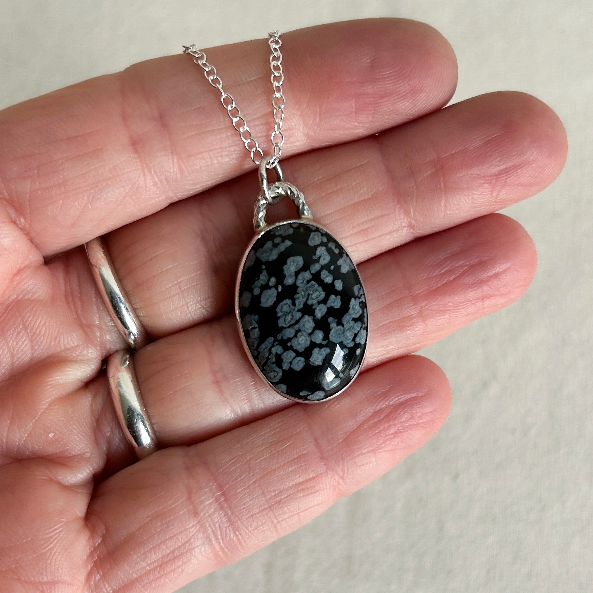This Snowflake Obsidian pendant features a sterling silver setting with a distinctive cut-out design on the back, allowing the natural pattern to be seen.